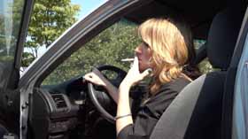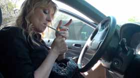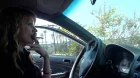 away, she has a problem starting it, so she lights up a cigarette to calm