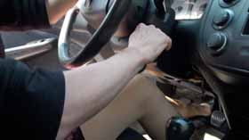 makes her way to her ‘01 Honda Civic and slams the clutch pedal in. Right