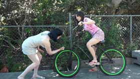 Next, Holly pops Lucy’s bike tires with an ice pick, making her helplessly