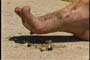 them in the dirt, and crushes them, without mercy, under her BARE FEET!