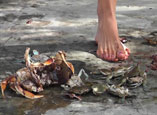 to inspect the bottom of her feet.She laughs at all the muck on her feet
