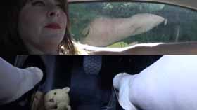 she takes rides in her car with her bear. She wears gold strappy high-heel