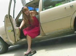Eva in her stunning red summer dress as she presses down hard on the gas