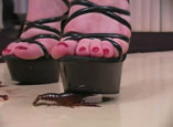 | Chloe arrives carrying a bucket of shrunken men. She has been on a roll lately, turning pathetic douchebags at the bars into miniature men and with a snap of the finger, she can transform their bodies into the helpless bug of her choice. Chloe has collected more little men than she has room for so she sets out to clean out the storage closet and make room for more victims. Wearing a sexy grey dress and powerful, strappy sandals, Chloe transforms the first bunch into crunchy beetles and crawdads that will soon die beneath her feet. More beetles, worms and roaches appear on the glass table and you watch from below as Chloe stomps their cheesy bodies. Alternating between the rock hard floor and the glass table, Chloe extinguishes the remaining hornworms, crawdads and goldfish. With the weekend approaching, Chloe can't wait to take part in the San Diego nightlife and collect even more disrespectful victims for her closet. 60 min. |