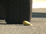 tires over some puny snails, a banana, a pile of worms and a few hotdogs!
