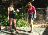 are out on the patio in short shorts, tank tops, nude hose, and spike