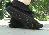 a close-up view as Chloe lifts up her moccasins to reveal the destruction