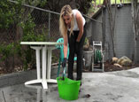 pants, gloves and some platform heels, Ivy struts outside to a huge bucket