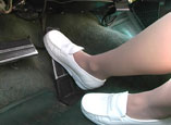 in the back seat for a pair of open toe flat sandals and tries to pump