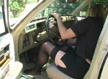 old Cadillac. She even tries slipping off her shoes and trying in her
