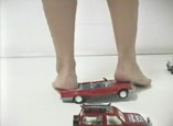 she tries her bare feet on some tiny plastic cars, feeling them crumble