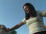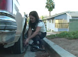 | Diana is about to head home from work wearing black pumps, black stockings and a short black skirt. When she gets to her Cadillac, she discovers all 4 of her tires have been deflated! She gets her foot pump out of the trunk and tries to inflate the first tire with a foot pump. It is hard work, as the tires are very flat and very big. She pumps faster and faster. By the time she gets to the second tire, her feet are aching, so she removes her pumps and puts on some flat loafers. It makes her ordeal a little more comfortable, but all of the pumping is getting her tired. By the time she gets to the fourth tire, she removes her shoes and pumps with just her stockings on her feet. She manages to get enough air in the tires, and is on her way after a grueling pumping session. 30 min. |
