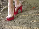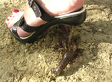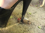 sandals with lethal steel heels. She continues to pound the crawdads in