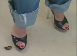the hard pavement. She is wearing frayed bellbottom jeans and a sexy top.