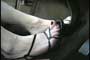 she reaches her leg in to pump up the gas pedal some more. She tries