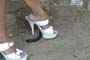 | Diana is out in the back yard wearing a bikini top, short skirt and white platform high heels to match her pearly toe polish. She is so busy talking on the phone she isn’t aware of the big crunchy millipede she just stepped on. There is a crawdad crawling on the dirt and the heel of her shoe stabs directly through his body as she casually walks by. Her victims are guppies, snails, millipedes, crawdads and roaches all ground into the grass without even noticing. Chloe is outside at the spot where she is supposed to be having a meeting but her client has not shown up! She is getting frustrated and impatiently pacing. Chloe is wearing black strappy open toe sandals and we can see her red polished toenails as she marches by smashing a green worm in the grass that she didn’t see. Her heel pierces a giant millipede and in the next step she crunches a snail and then a crawdad is obliterated under her feet. Chloe is now wearing black leather pumps with metal spike heels, still outside waiting. Her thin spike heels sink deep into the dirt piercing more unseen worms, snails, crawdads and millipedes. Chloe’s feet are tired and she changes her shoes one final time into black strappy platforms and is on the path of destruction again. More victims are annihilated unnoticed beneath her feet. 60 min. |