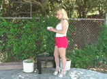 tank top, tiny shorts and gorgeous, strappy, red platform sandals she