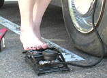 | Chloe is a sexy secretary who arrives to work wearing a short red skirt and a small black top. Her sexy bare feet are nestled in a pair of black pointed toe slides with silver heels. She gets to her desk and finds a foot pump with a note from her boss next to it. The note says that there is a car in the parking lot with four flat tires. The car looks bad and is bad for business, so Chloe has to go out and manually inflate all four tires. She reluctantly takes the pump and heads outside. When she gets to the car, she sees that the two front tires are almost flat, and the two back tires are completely flat! She starts with the front tires since they already have a little air in them. Chloe works the foot pump hard. The camera angle moves in for some great close ups of her picturesque leg muscles gleaming in the sunlight. After much pedal pumping punishment, Chloe moves to the back tires. Already feeling fatigued from the front tires, Chloe decides to slip off one her slides and pump the pedal with her amazing bare foot. She slides her shoe off, revealing her shiny black toe polish. She gets to work pumping the pedal with her sexy bare leg. Sweat glistens from her forehead. She pumps faster and faster, removing her other shoe as she switches her pumping foot. Her sexy legs work the pedal until all the tires are finally full. Exhausted, Chloe heads back inside to her cool office. When she gets back in she decides that she is going to take an early break to get a drink and try and cool down. 30 min. |