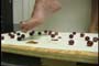 with her bare feet. Some are slowly squashed, while others, she stomps out