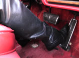 in her 85 Cadillac Seville wearing a dress and black thigh high leather