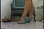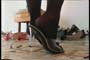 slips on a pair of black pantyhose and tries to find the perfect shoes