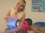 | Slave Anna was the star attraction at Mistress Chloe’s party last night and she wakes up still confined to her table with a face full of red paint and a splitting headache! Those dang party guests were using her head as a human bongo! Unfortunately for Anna, Chloe is not finished with her humiliation and is already planning the next party. An artist is coming by this afternoon to create a work of art using Anna as the centerpiece and Chloe needs to set the perfect backdrop. Mini skulls, purple cobwebs, shrunken heads, vampire teeth, piles of boxes and various decorations are all piled high on Anna’s trapped head. Ultimately Chloe settles on a huge, curly wig, giant disco style glasses and a funny mustache while she blows smoke in Anna’s face and makes her sing along to the toy monsters running by her face. The artist will be so impressed when he arrives! 30 min. |