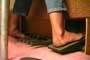 slips off her sandals. She is wearing capri jeans, and some sexy full