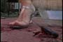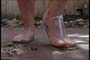 sandals. A crab is viscously crushed under her calf high platform boots.