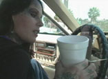 a ride to school in her old stick shift Honda. She's wearing baggy blue