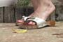 | Taylor’s mom has said she can’t keep her pets in the house anymore so she has brought them outside to get rid of them. She grabs a tiny goldfish and places him under her heel inside the back of her white Dr. Scholl sandals. Her short white skirt shows off her powerful sexy legs as she lowers all her weight onto his helpless, slimy body and presses him flat. One after another she exterminates dozens of her pet goldfish under the heel and on the insole of her shoes. All of Taylor’s pet crawdads are the next little guys to go. She carefully places each victim inside her sandal and then inserts her foot into the shoe and squashes their crunchy bodies as the juices ooze between her pink polished toes. She’s made a sloppy mess of carnage but there are no more pets in sight now. 45 min. |