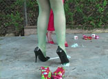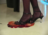 | Mistress Chloe falls asleep while watching TV and comes to in a dream wearing a red bodysuit, black stockings and white pumps. An alien attacks her with his goo and she becomes solidly stuck to the pavement as his green slime oozes down her shoes. She comes to with her hands tied above her head and her feet stuck to the floor in bright, orange goo. She frees her hands but can’t free her feet! She wakes from her dream, walks outside and is once again stuck to the concrete where the alien covers her pumps in his sticky goo. In the second segment, Amber comes in to pick up an envelope but finds the door locked from the outside when she tries to leave. She is wearing a tight dress, black stockings and sexy black sandals. She searches for a key but gets caught in a pile of sticky goo that was hidden in the corner. Her feet strain as she tries to free her feet and the glue gets caught in her stockings as she struggles to free her stuck sandals. In the final segment, Edie and Dylan are on their way to the office Christmas party. Their sexy pumps get stuck in a pile of gum and as they try to free themselves, a giant roach sprays its sticky goo all over the! Daisy and Mary Jane are on their way to the same party but little men, a giant roach and a giant rat all spew their sticky substances on the pavement and stick their pumps firmly in place! Will the girls ever make it to their party? 30 min. |