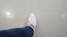 toward her foot, as you watch her white Keds-covered foot tap up and down.
