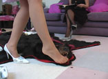 | The unboundedly attractive duo, Eve and Sister Superior, are a pulchritudinous pair of well off women. They are coming home to their cozy apartment after a busy day. Eve is in a pair of form fitting dark blue jeans, a sexy red top, nude stockings,and a pair of tan pumps. Sister Superior is wearing light blue jeans, a small brown top, black stockings, and some sexy black pumps. The girls have been on their feet all day and want to relax. Eve slips her pumps off and rubs her stockinged soles on their plush bear skin rug. Sister Superior is reading a magazine article about the homeless problem in America, and comments on how many bums she sees during the course of her day. Eve agrees and complains that she can't even go down the street without being harassed for a hand out. Both the girls are disgusted at the vile vagrants and laugh about how well off they are compared to them. They make fun of them for having nowhere to live and having nothing to eat, while they relax in their luxury apartment and enjoy decadent meals. Sister Superior gets an idea to bring in a homeless man and tease and belittle him. Both girls are excited as they go out find a bum. The camera changes to a point of view angle, and you get to see through the eyes of a lowly homeless vagrant. The girls invite you in and immediately start to humiliate and belittle you. Eve changes into a sexy pink dress, while sister Superior puts on a alluring black knee high dress. The girls start to tease you with their sexy legs, seductively peeling their stockings off, revealing their beautiful unpolished toes. They try on many different pairs of heels and strut their stuff, trampling the bear skin rug, while you kneel down in front of them. They decide to have a contest to see who can be meaner to you. They make you empty your pockets and take whatever change you have. They humiliate you and make you smell your own armpits. The girls go into the kitchen to get some food, and then eat it in front of you while laughing and pointing at you. Eve decides to share her burger with you, but smashes it with her heels before making you eat it. Finally they make you take off your pants and they heckle you for having such a small penis. Eve notices that it's starting to sprinkle outside. The girls decide that they've had enough fun with you, and kick you out just before it starts to rain. 60 min. |