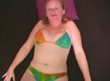 orange and green tie-dyed string bikini as your eyes follow to her tummy.
