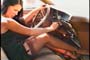 heel strappy shoes. She gets the car started with her vigorous foot action,