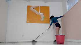 from under her! She then gets a mop and is able to stand up using the
