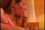 teeth. She then goes back to the bed, still sucking sensually on her fingers.