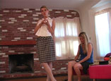 white checkered skirt and slowly peels away her nude hose. She grabs one of