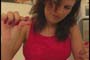 tiny little half inch people in the palm of her hand. Her long red fingernails