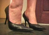 toe pumps and towers over you in a short pleated white skirt. While working