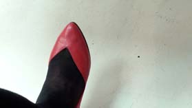 flats. She has you sit on her lap, facing her foot as she taps away. She