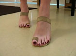 tiny short skirt, sexy panty hose and red pumps with an ankle straps.