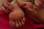 Jacqueline slowly runs her feather up and down her bare soles to find out