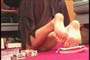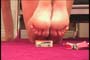 beneath her enormous bare feet. Watch closely as she sits back onto her
