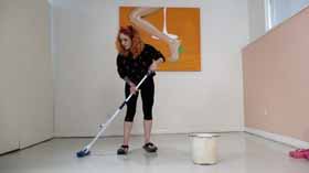After a while, she decides to mop up the mess, but the water on the floor