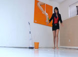 skirt business outfit with some wedge flip flops. She has to mop the floor