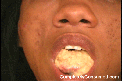 Amber chews crackers to liquid and shows you them in her wide open mouth. 2 min. $3